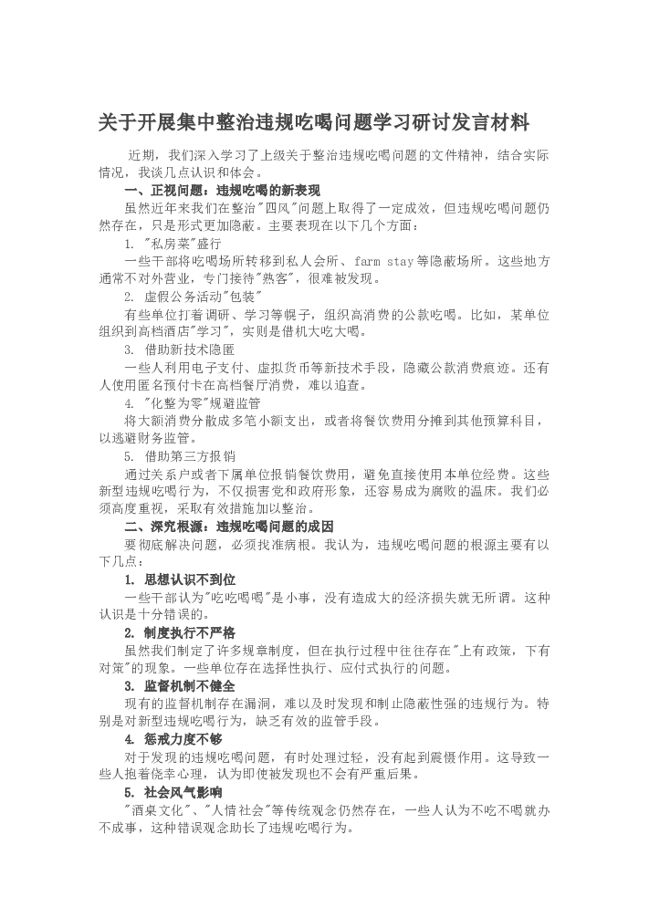 关于开展集中整治违规吃喝问题学习研讨发言材料