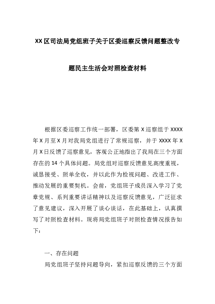 XX区司法局党组班子关于区委巡察反馈问题整改专题民主生活会对照检查材料