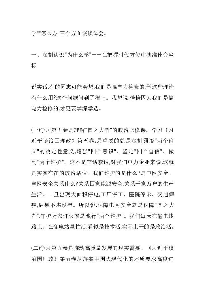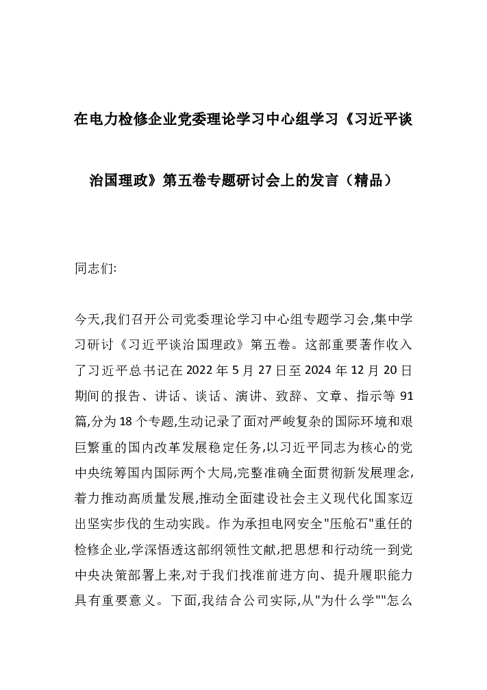 在电力检修企业党委理论学习中心组学习《总书记谈治国理政》第五卷专题研讨会上的发言(精品)