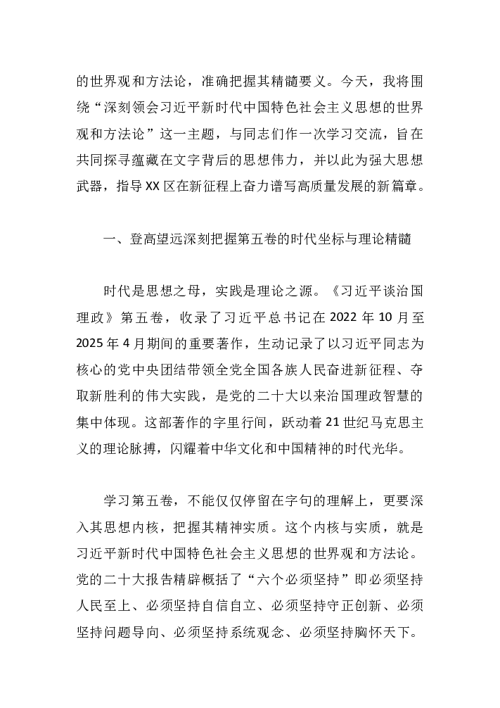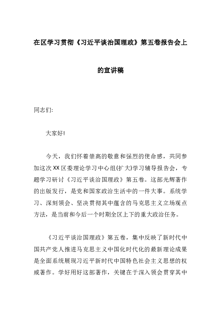 在区学习贯彻《总书记谈治国理政》第五卷报告会上的宣讲稿