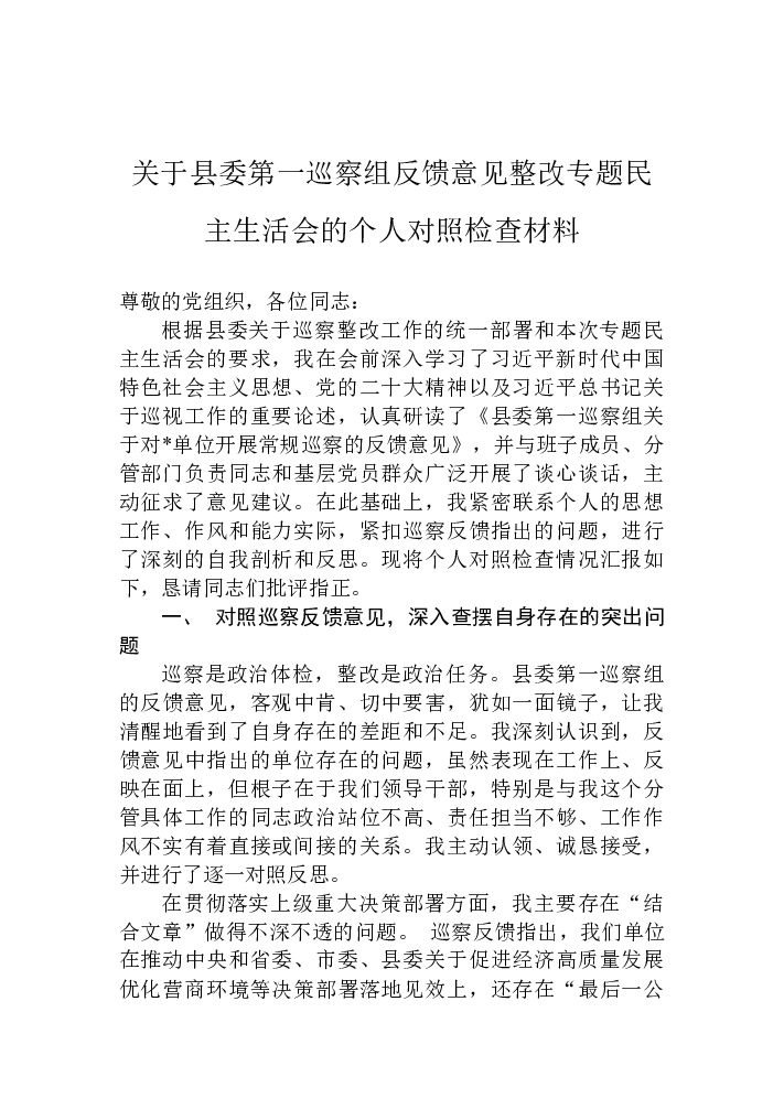 关于县委第一巡察组反馈意见整改专题民主生活会的个人对照检查材料
