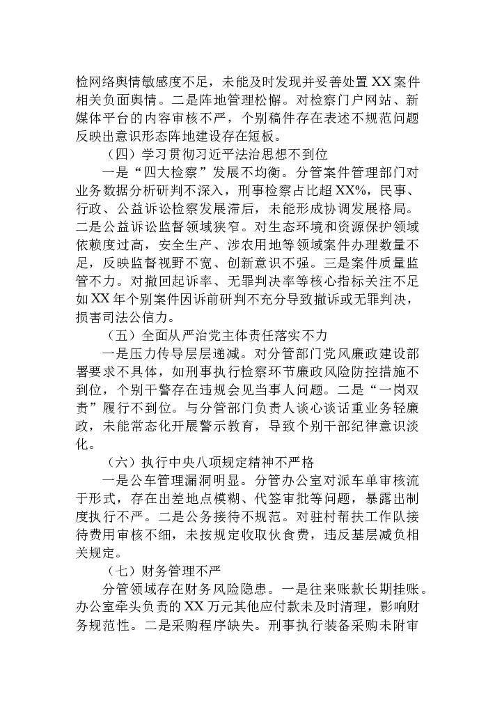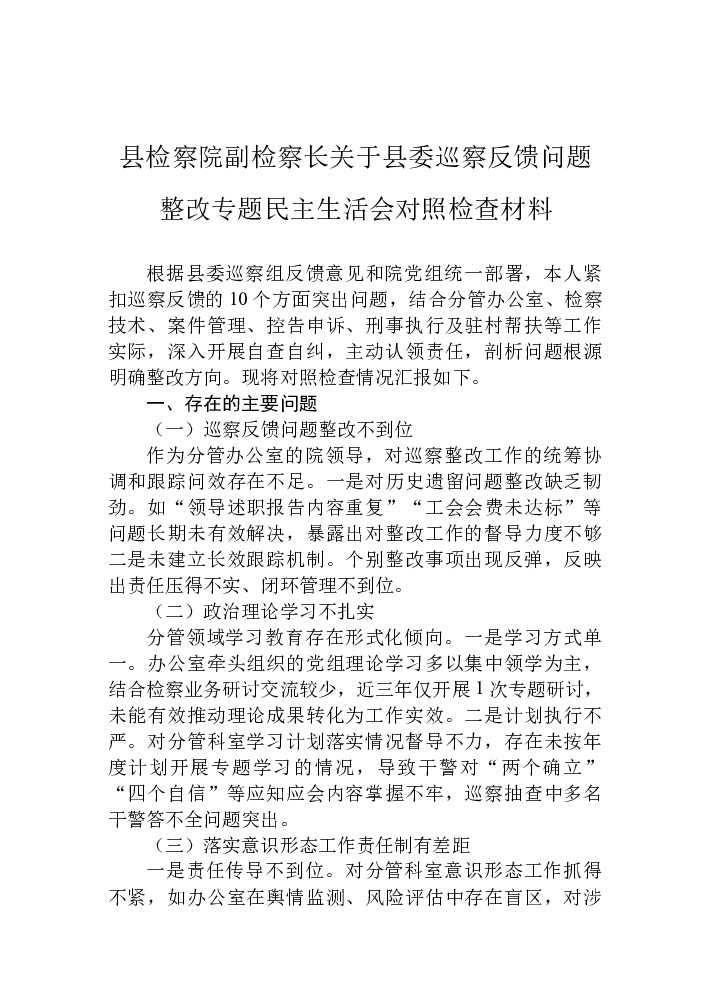 县检察院副检察长关于县委巡察反馈问题整改专题民主生活会对照检查材料