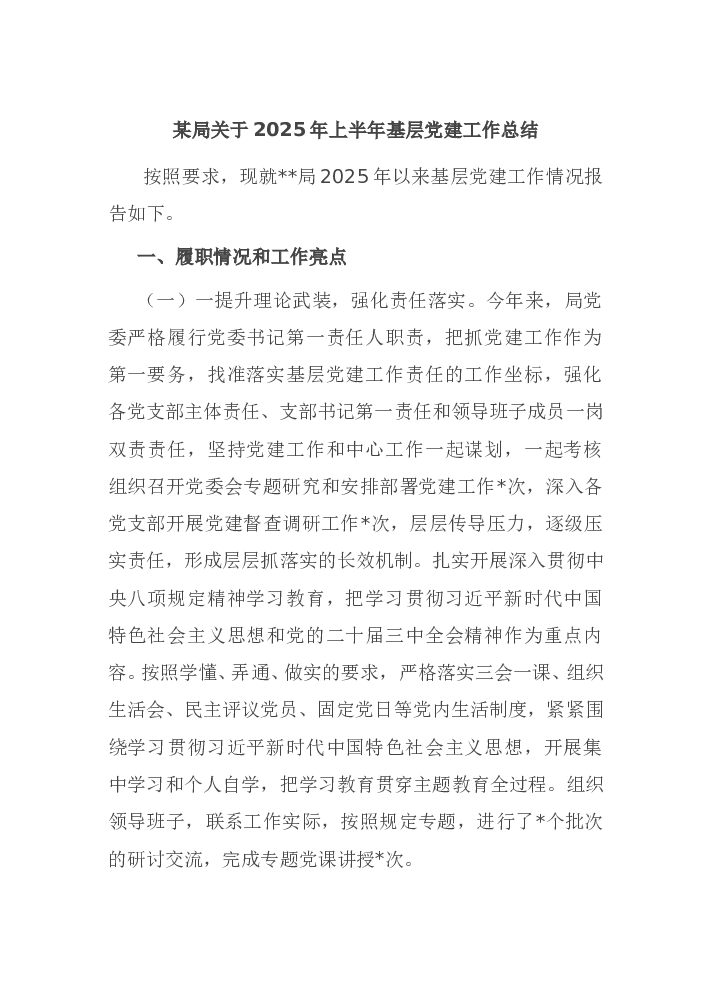 某局关于2025年上半年基层党建工作总结