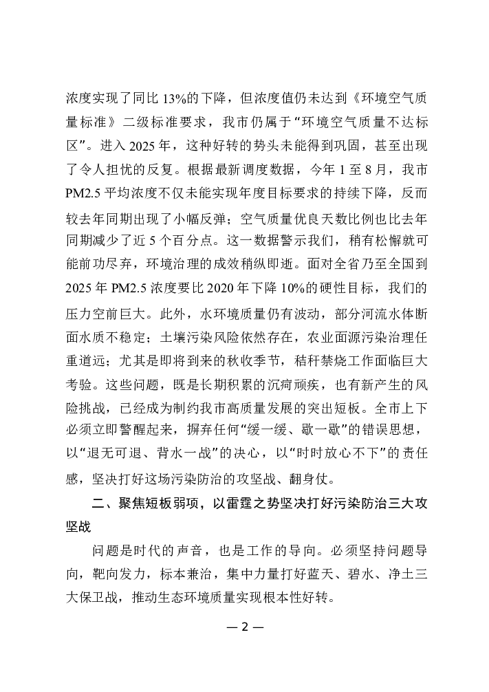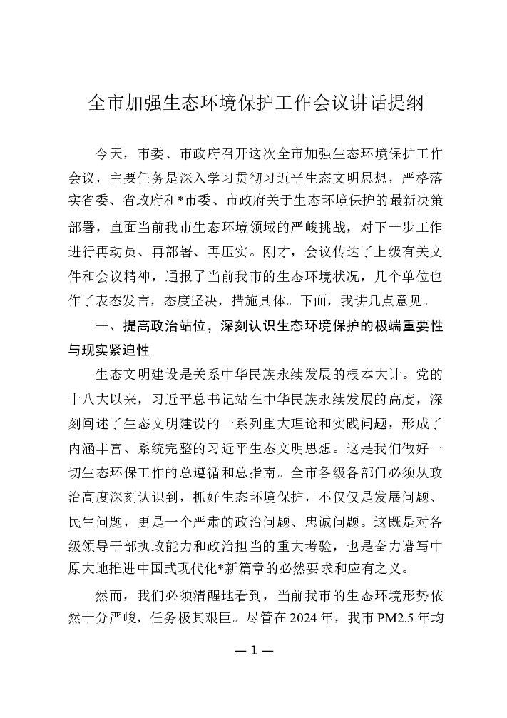 全市加强生态环境保护工作会议讲话提纲