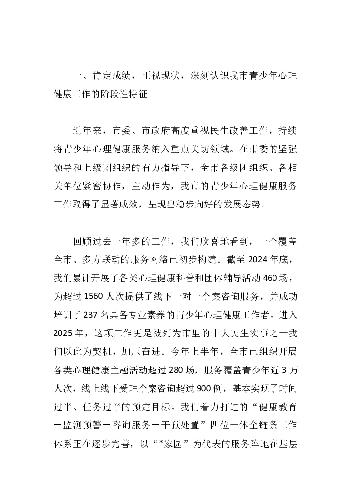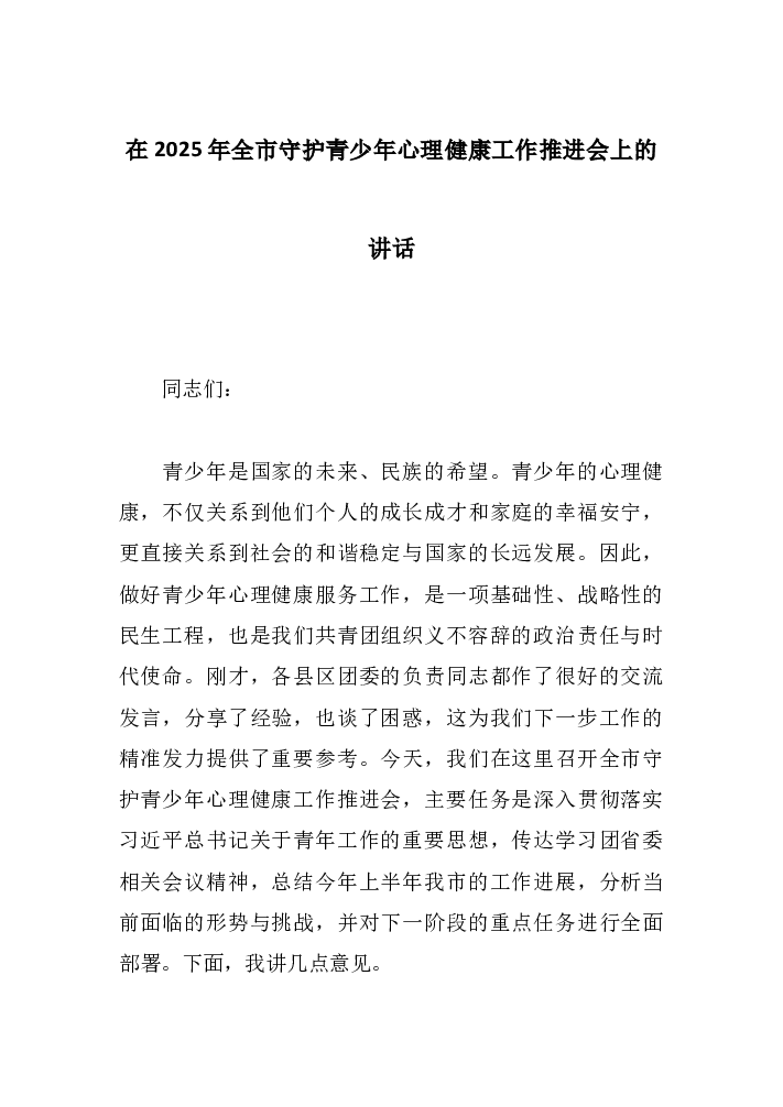 在2025年全市守护青少年心理健康工作推进会上的讲话