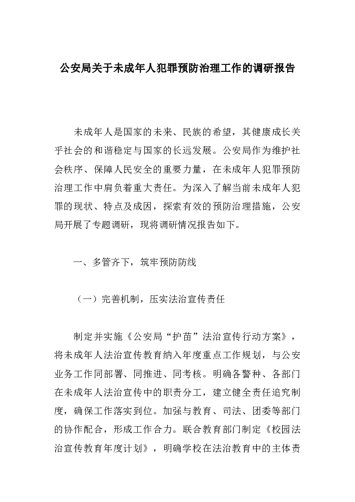 公安局关于未成年人犯罪预防治理工作的调研报告