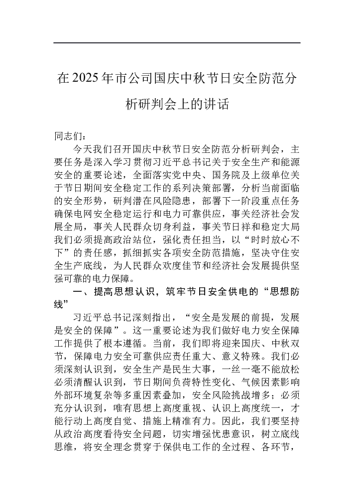 在2025年市公司国庆中秋节日安全防范分析研判会上的讲话