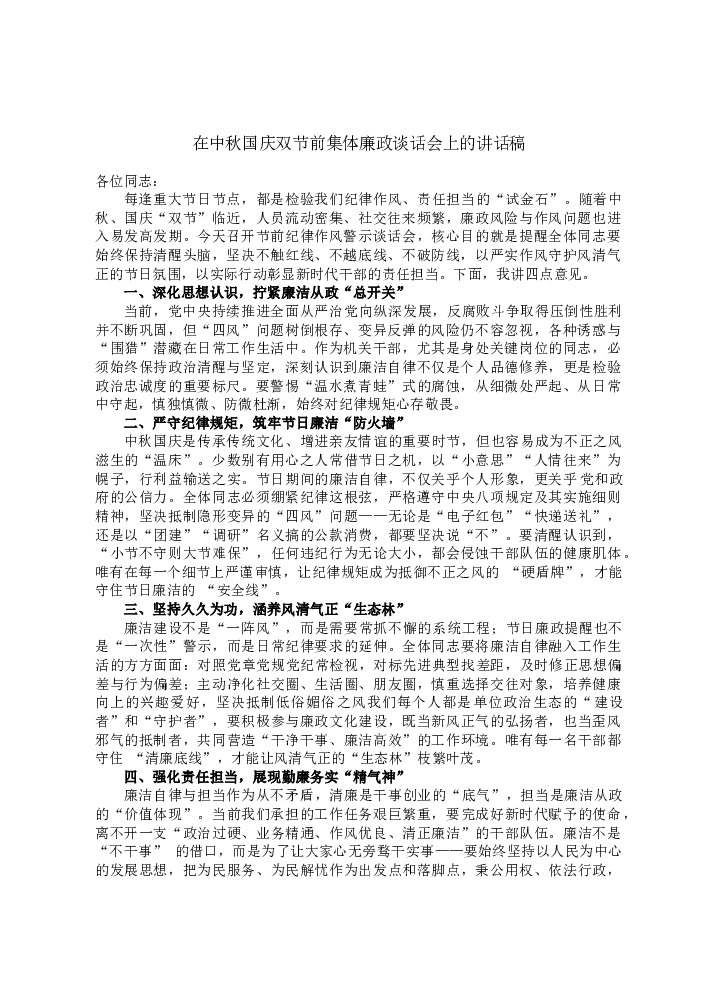 在中秋国庆双节前集体廉政谈话会上的讲话稿