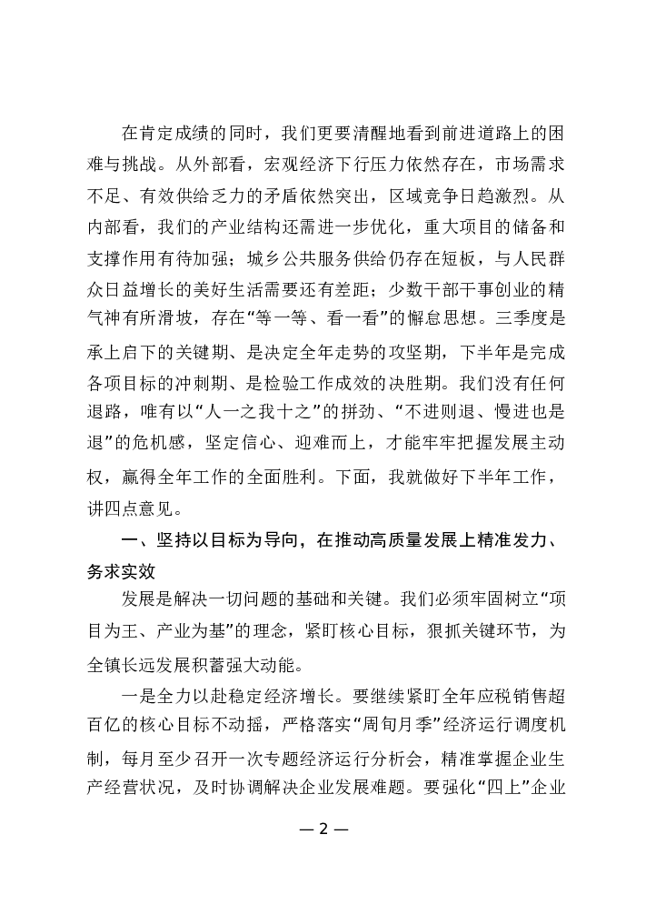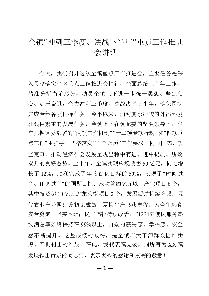全镇“冲刺三季度、决战下半年”重点工作推进会讲话