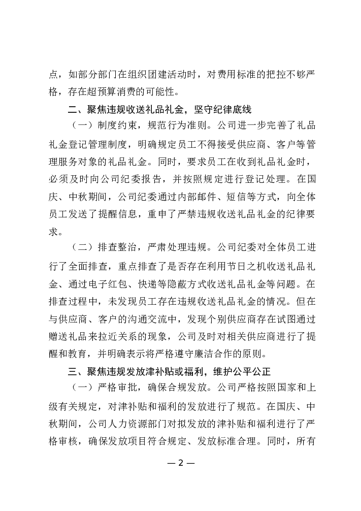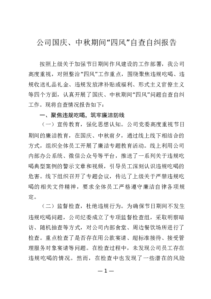 公司国庆、中秋期间“四风”自查自纠报告