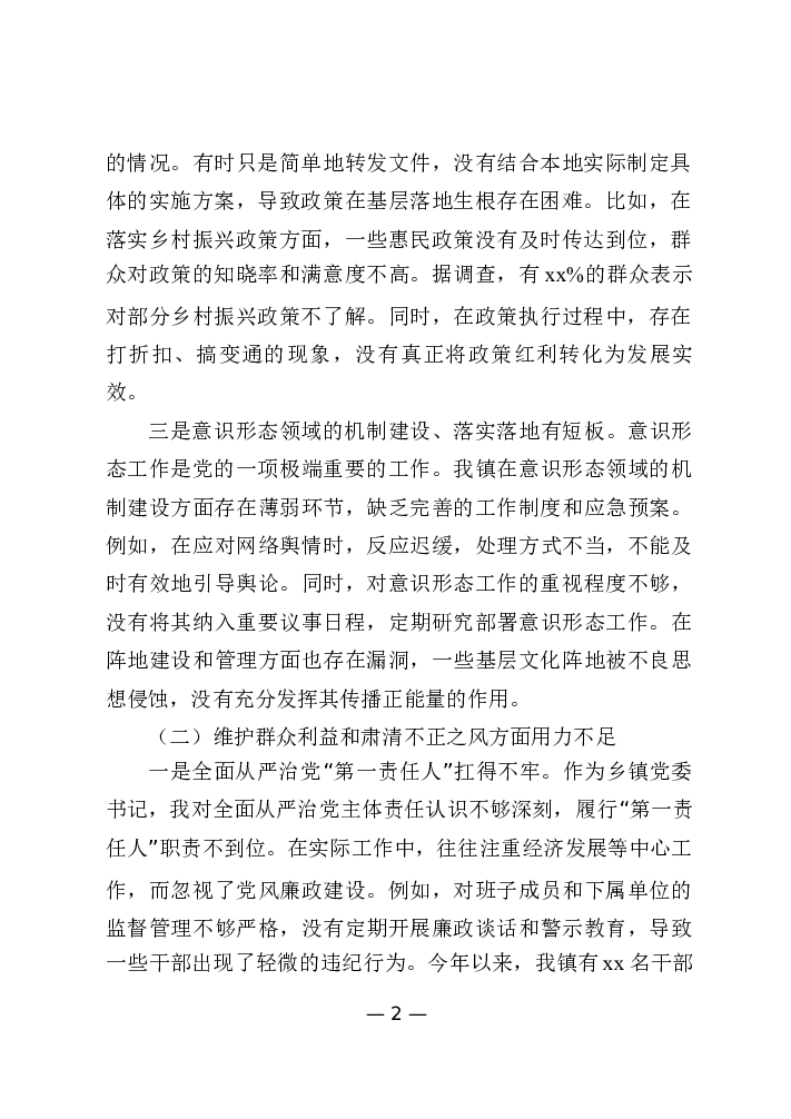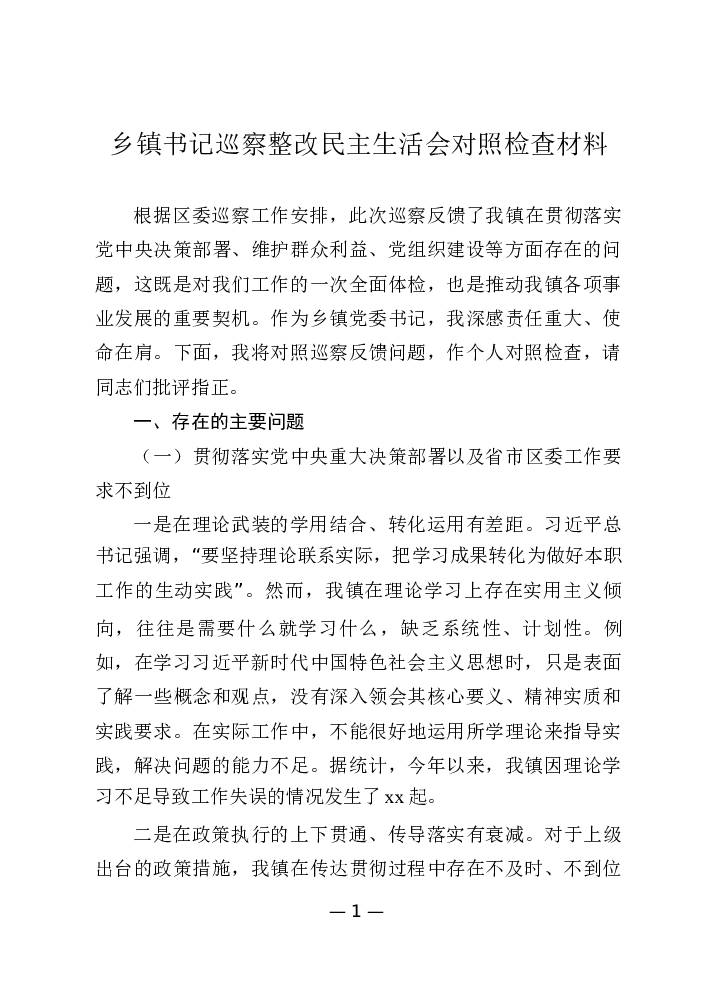 乡镇书记巡察整改民主生活会对照检查材料