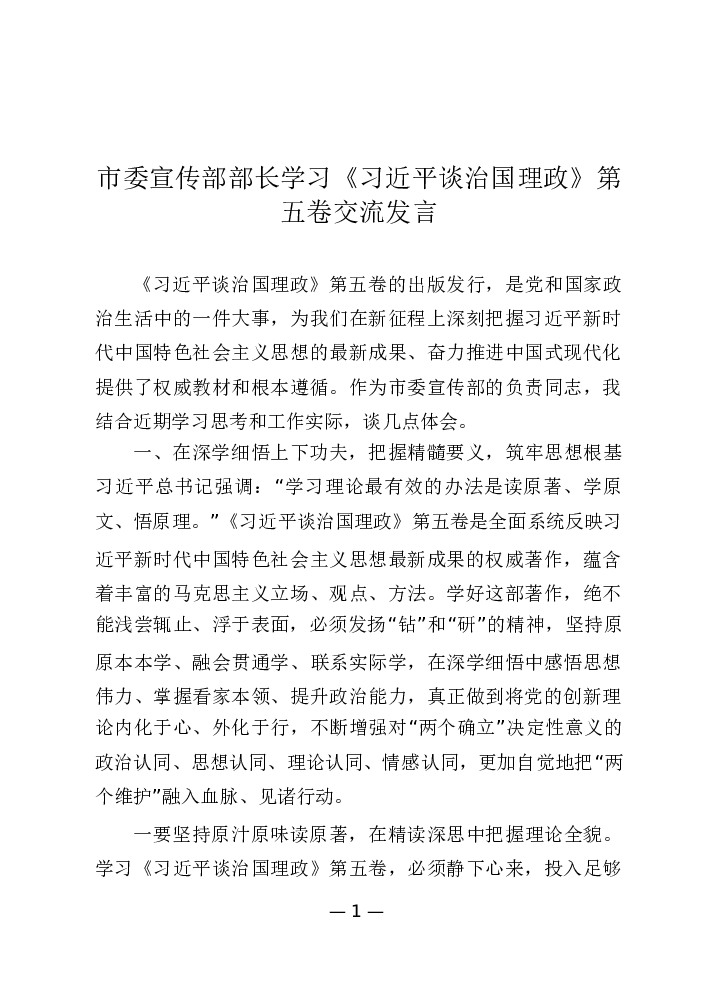 市委宣传部部长学习《习近平谈治国理政》第五卷的交流发言