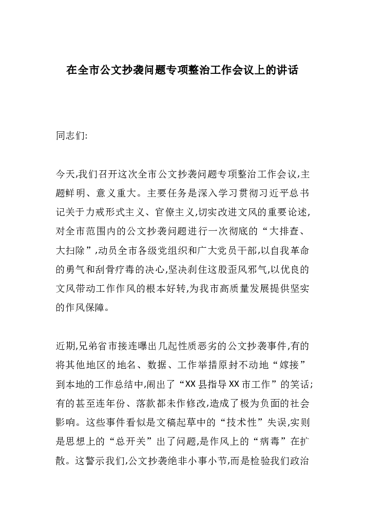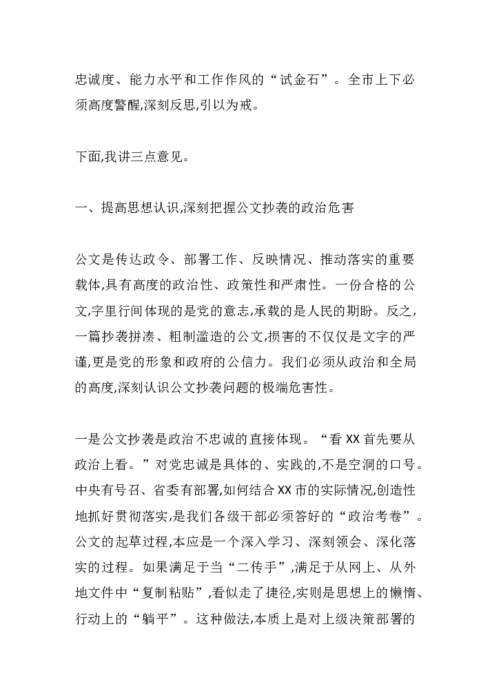 在全市公文抄袭问题专项整治工作会议上的讲话
